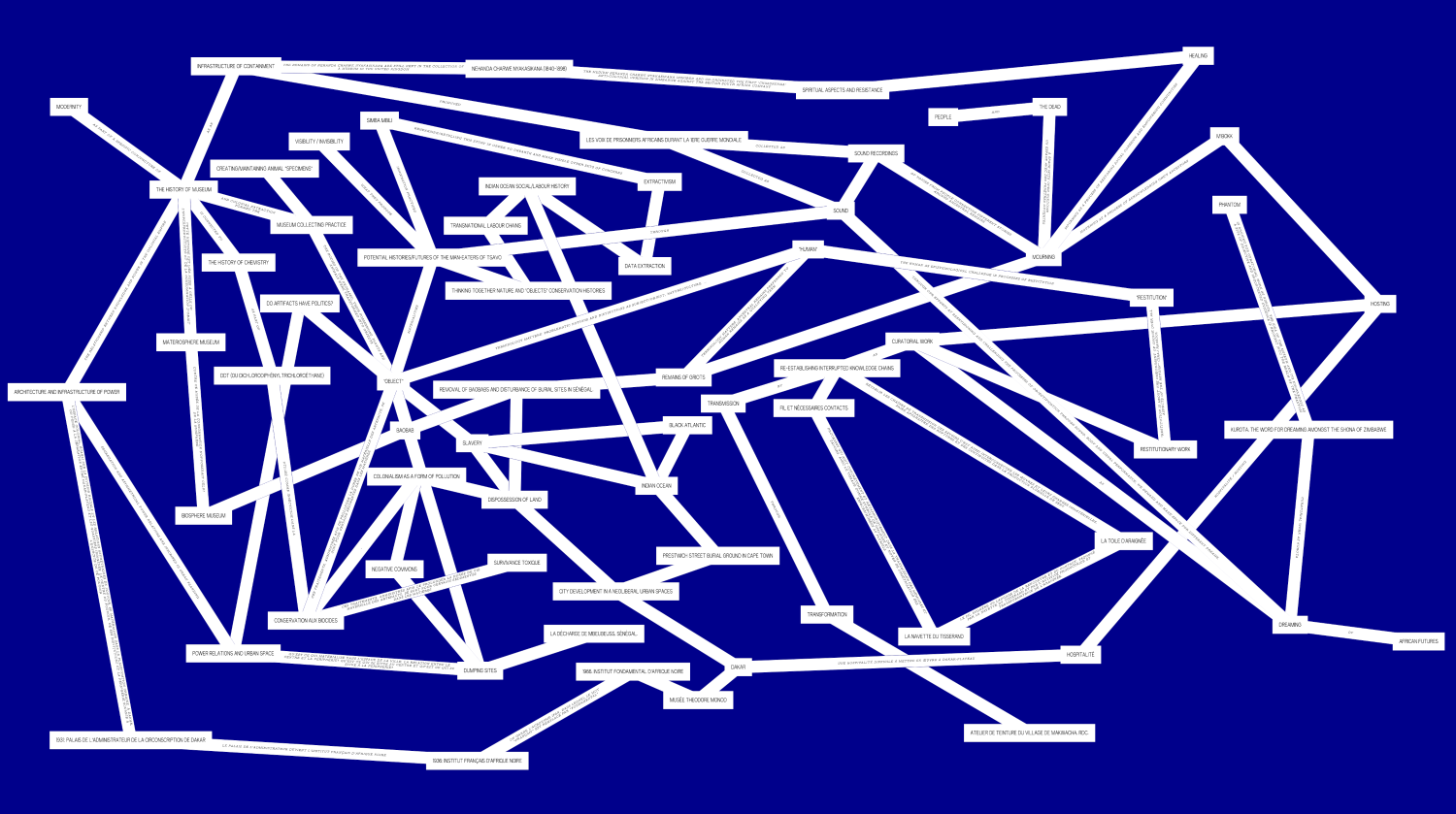 Map of the connections between the individual research projects in the context of the exhibition "Branching Streams. Sketches of Kinship" by the international research team Reconnecting 'objects' (reconnecting.art) at Théodore Monod African Art Museum, Dakar. The map was designed and hand drawn by Ayoh Kré Duchâtelet and Lionel Maes.